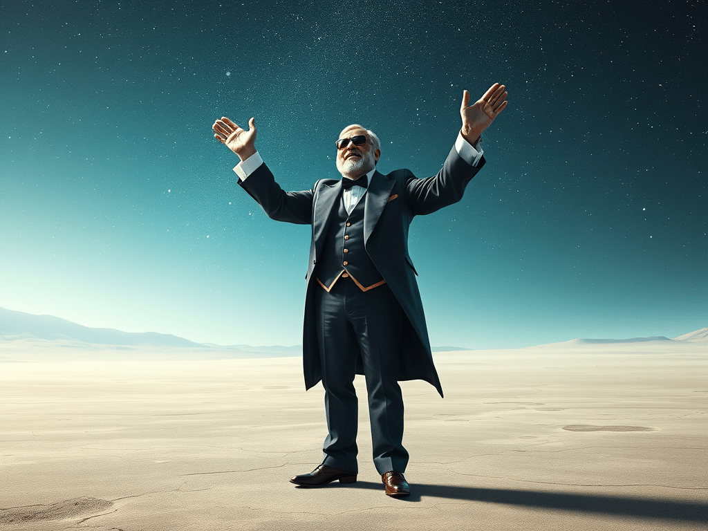 Pria itu tertawa kecil, seolah-olah pertanyaan itu tidak penting. “Bukankah kau di sini untuk mengagumi aku? Aku adalah orang yang paling tampan, paling berpakaian rapi, dan paling cerdas di seluruh planet ini!”