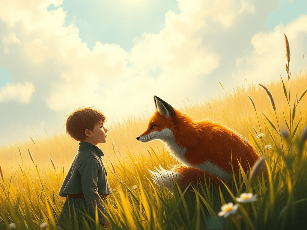 Pangeran kecil mengikuti nasihat rubah itu. Setiap hari, ia datang dan duduk lebih dekat. Mereka berbagi keheningan yang penuh arti, membiarkan waktu menenun benang-benang keakraban yang lembut di antara mereka. Perlahan, hati mereka saling terikat, dan padang rumput yang luas itu tidak lagi terasa sunyi.