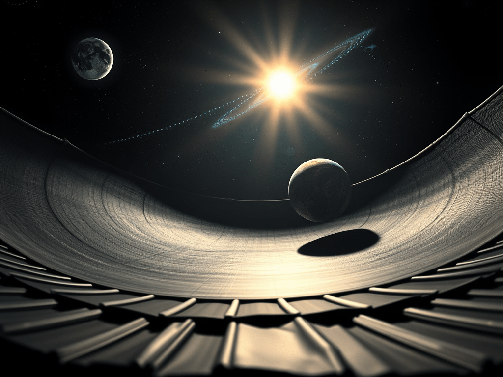 Bayangin kamu naro bola bowling di atas trampolin, terus kamu lempar bola tenis. Bola tenis bakal ngelilingin bola bowling itu bukan karena “ditarik,” tapi karena dia ngikutin permukaan trampolin yang sekarang udah ngelengkung. Gitu juga bumi yang ngelilingin matahari. Jadi, bumi bukan “ditarik” ke matahari, tapi dia lagi surfing di lekukan ruang-waktu.